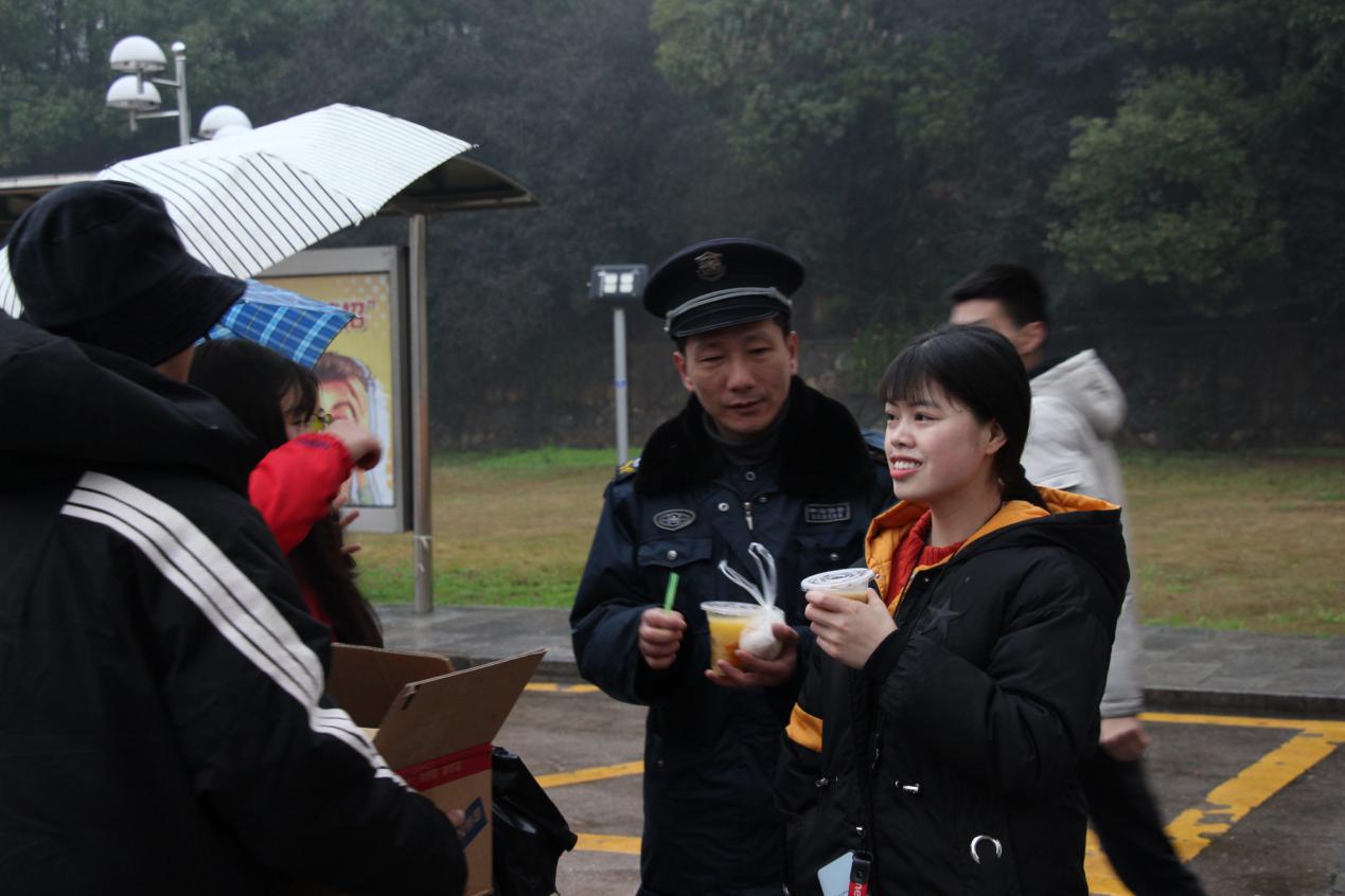 初春的寒意未散,吳玉容學姐與人文志愿團成員在校園里裹著棉襖,撐著雨傘,在等待路過的校園工作者。雖然這次是為了本次活動而特意早起,但是與常年起早貪黑工作的校園工作者相比,這點小苦小累實在是算不了什么。而環(huán)衛(wèi)工們,拖著沉重的垃圾車,穿著塑料雨衣,與大家形成了鮮明的對比。
