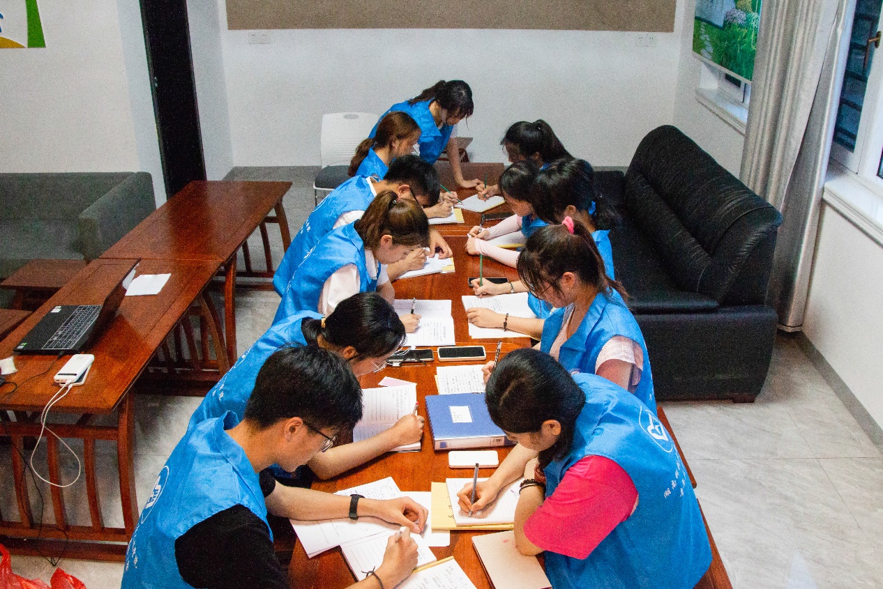 "嘀嘀、嘀嘀……",六點(diǎn)的鬧鈴一響,志愿者們迅速起床洗漱。早飯后,他們沿著兩側(cè)布滿牽牛花、狗尾巴草的小道來到教學(xué)點(diǎn)。人文學(xué)院團(tuán)委書記曾思妍說:“在昨天了解當(dāng)?shù)亓羰貎和⒔虒W(xué)環(huán)境等情況之后,我們便組織開會(huì)為各個(gè)班級(jí)分配了班主任及科任老師,要求各位志愿者提前備課,以確保今天的的教學(xué)順利進(jìn)行,讓留守兒童感受來自青年志愿者們的溫暖與關(guān)懷。”
