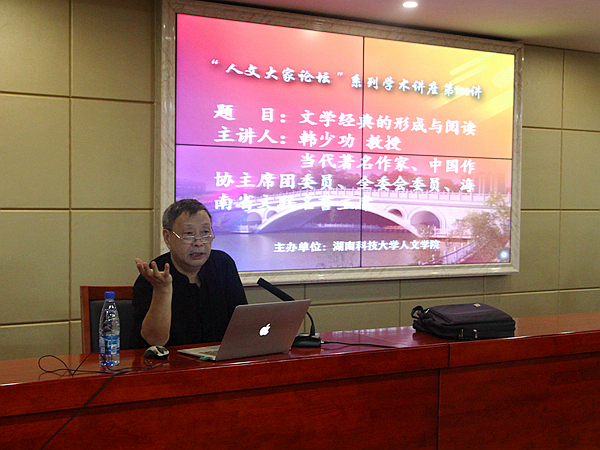 9月18日下午15點,當(dāng)代著名作家韓少功教授應(yīng)邀于立言樓B4-1舉辦“文學(xué)經(jīng)典的形成與閱讀”主題學(xué)術(shù)講座。本次講座由彭在欽教授主持,潘年英、吳投文、劉昕華、丁志叢等老師及漢語言文學(xué)專業(yè)部分學(xué)生到場聆聽。