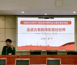吳廣平老師對(duì)9917班返校校友表示熱烈歡迎,并以“走進(jìn)古老的詩(shī)歌圣經(jīng)世界—《詩(shī)經(jīng)》導(dǎo)讀”為題為9917班校友和23110103班學(xué)生再上一堂課。他通過(guò)對(duì)兩則《詩(shī)經(jīng)》的解讀告訴在場(chǎng)的學(xué)生們,我們做人最重要的就是要尊重長(zhǎng)輩,尊敬父母,要懂得報(bào)答父母。同時(shí)要堅(jiān)持人與自然和諧發(fā)展,熱愛(ài)自然,親近自然。