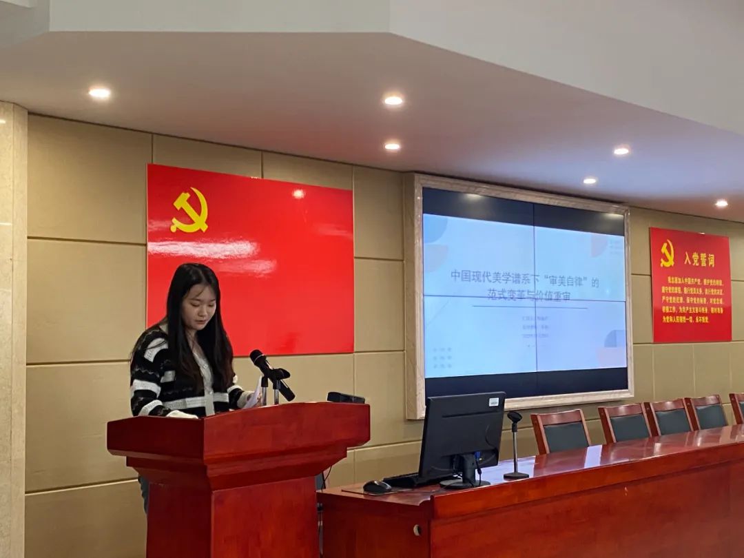 陶瑜芹同學(xué)匯報(bào)的題目為《中國(guó)現(xiàn)代美學(xué)譜系下‘審美自律’的范式變革與價(jià)值重申》,從美的啟蒙、美的對(duì)話、美的反思三個(gè)方面闡述了審美自律與審美意識(shí)形態(tài)的雙重延伸。
